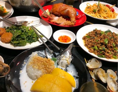 推荐:花甲飞天通菜椰香芒果饭泰式猪颈肉冬阴功 海鲜mama面招牌青汁三文鱼招牌大鸡比芒果糯米饭...