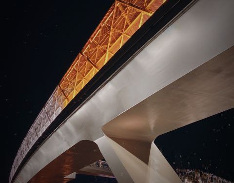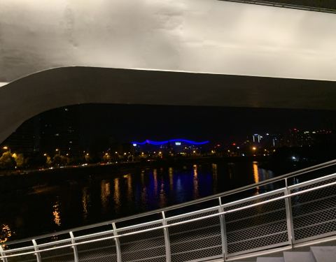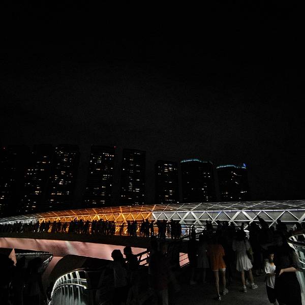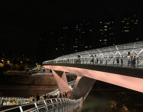 成都现在新的网红桥 弧线形状还是蛮有特点的说 甚至凌晨12点都还有人来参观和摆摊奏乐 白色的灯光和黄色的效果 配合远处的环球中心 让这座天府绿道的节点成为了不错的观景台