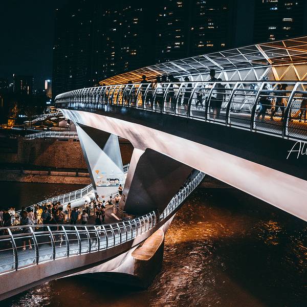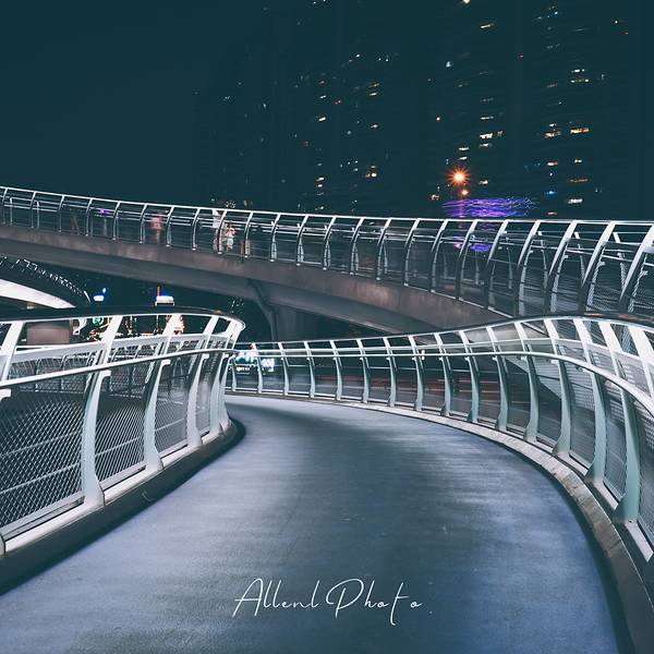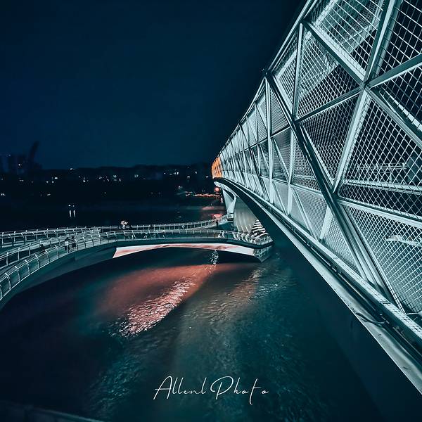 『五岔子』锦江上的莫比乌斯环 要说2020年成都最火的地方有哪些,当时的五岔子大桥绝对榜上有名,出发前连我这个外地人都知道必须要去看一看,于是当时趁着住在世纪城天堂洲际酒店期间专门找个晚上步行过去打卡。五岔子大桥横跨锦江,是一座连接成都高新区桂溪和中和街道的人行桥梁(非机动车也可以通行),由主桥和副桥两座桥梁按照类似“莫比乌斯环”的三维设计环绕而成,极具曲线美和未来感!夜间的灯光效果大气而绚丽,更是凸显了大桥自身所独有的流线美和科技性。其实航拍是最能直观感受五岔子大桥那类似“无限之环”的绝妙设计,不过当时去的时候附近区域已经严禁使用无人机了。由于当时是热门打卡地,夜间来大桥纳凉的人非常多,所以如果想要拍好照片就需要寻找各种刁钻的角度以及摁快门的果断,当时还有人建议我凌晨再去拍大桥……桥体的灯光会在暖色和白色间切换,通道里的人仿佛处在一个神秘的光影隧道中,很有赛博朋克风。大桥上的蓉城夜色,一派流光溢彩~