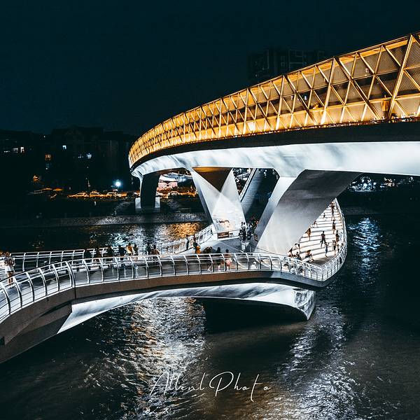 免费网红大桥,立体设计,白色桥身,桥形体量大,楼梯像琴键,夜晚灯光开上,想童话里的故事。已经持续火爆了半年了,白天人少,晚上人很多。