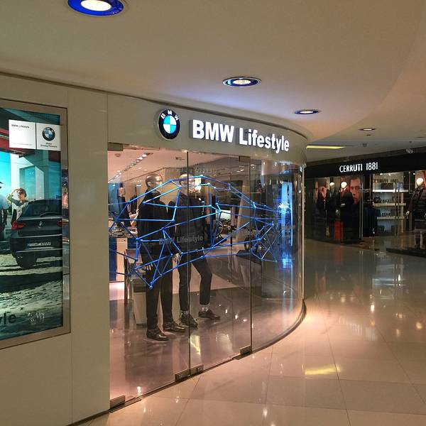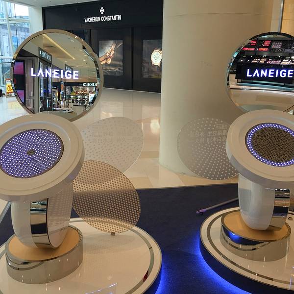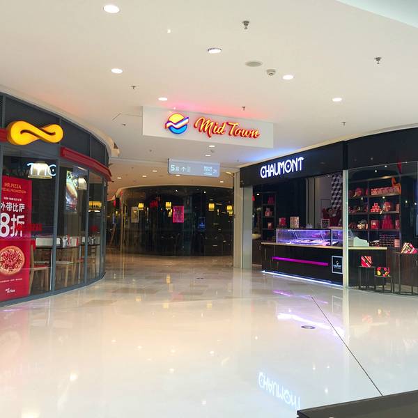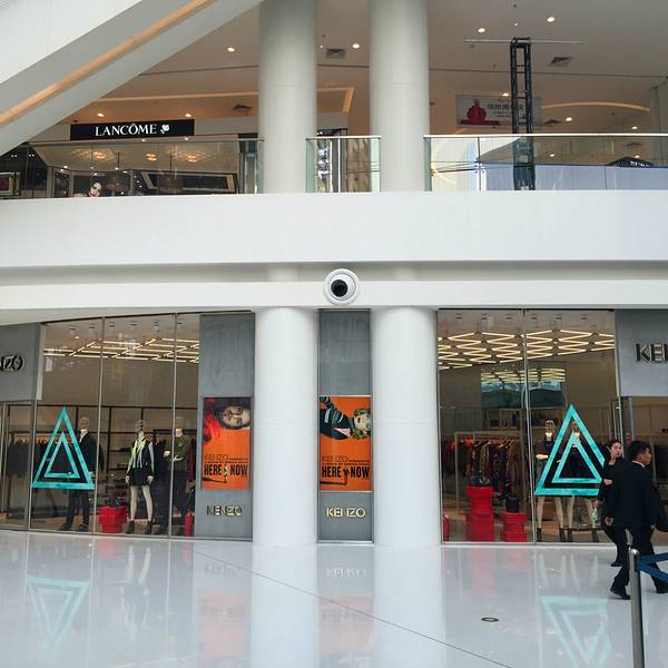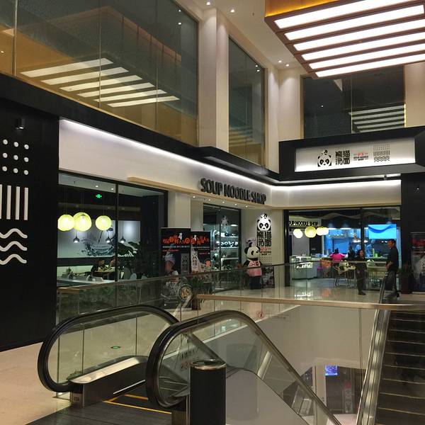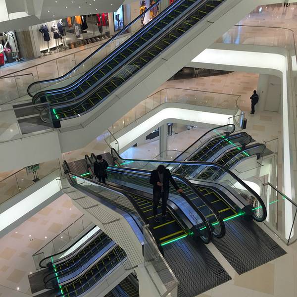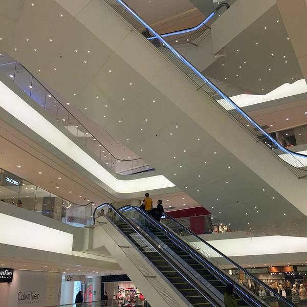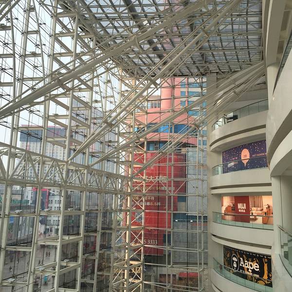 商场靠内部的扶梯,向上看,小蓝灯均匀散布在白色的扶梯底部,宛如晴朗夜空繁星点点。向下看,纵横交错的扶梯犹如热带雨林的大小瀑布,湍水石流。纵观整个商场,科技感与现代感毫无违和地交融在一起,紧跟——甚至超越时代的气息扑面而来,加速着每个顾客心跳的节奏。