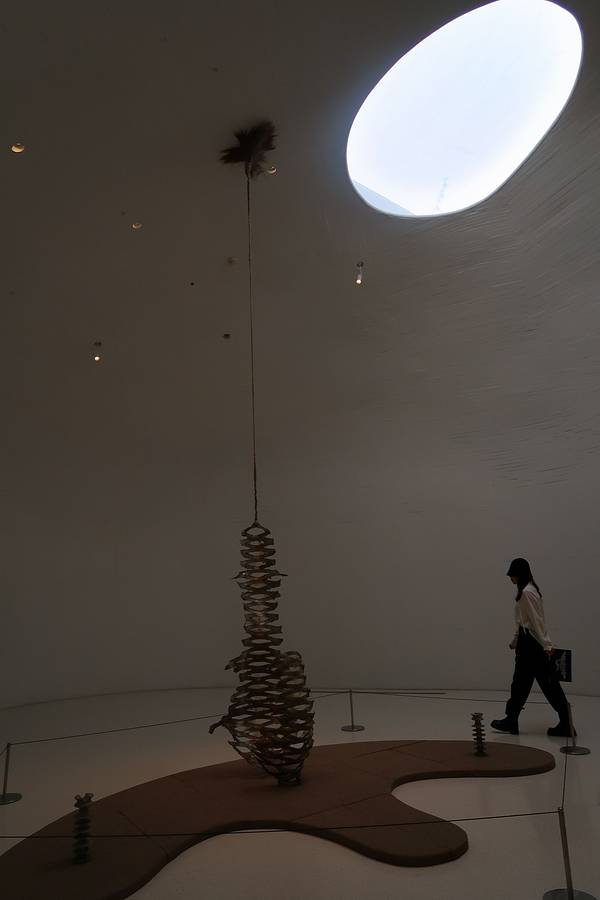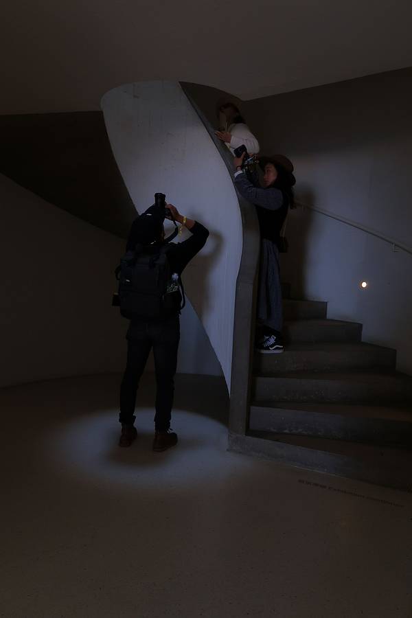 “沙丘美术馆复杂的三维曲面壳体,是由秦皇岛当地擅长造船的木工,用木模板等小尺度线性材料手工编织出的模板定型,并用混凝土浇筑而成。建筑师保留了混凝土壳体上留下的不规则甚至不完美的肌理,让手工建造的痕迹可以被触摸、被感知。”以前只觉得欧洲的建筑设计师很厉害,设计并完成了很多超乎人类想象的建筑作品,但在了解阿那亚的过程中,意外的发现了这个隐藏在沙丘里的神秘建筑,让我不禁感叹,国内的设计也很优秀呀~ 美术馆里各展厅都是连通的,如洞穴一般,形状各异,中心展厅是连接各洞穴的枢纽,也是空间最大的,随着时间的变化,光线从顶部的小小天窗折射下来,在墙上跳跃,展览品放置其中,静谧且神圣。 靠海的展厅用大面的弧形通透玻璃落地窗,隔绝风沙的同时,营造出绝美的室内海景图,不同的时间,不同的洞口,你所见到的大海的样子都是不同的。 另外馆内还有一座螺旋楼梯,楼梯顶是一面圆形○的玻璃天窗,抬头便可以看到天空的那一抹蓝,从暗处循着光线拾级而上,来到顶面的观海平台,没了洞穴的防护,置身与天与海之间,感受着海风的冷与热。 也许我对美术馆内的展品无从感知,但能置身于美术馆这件艺术品本身,就足够享受了~"在建筑中漫游,接近自然与艺术"