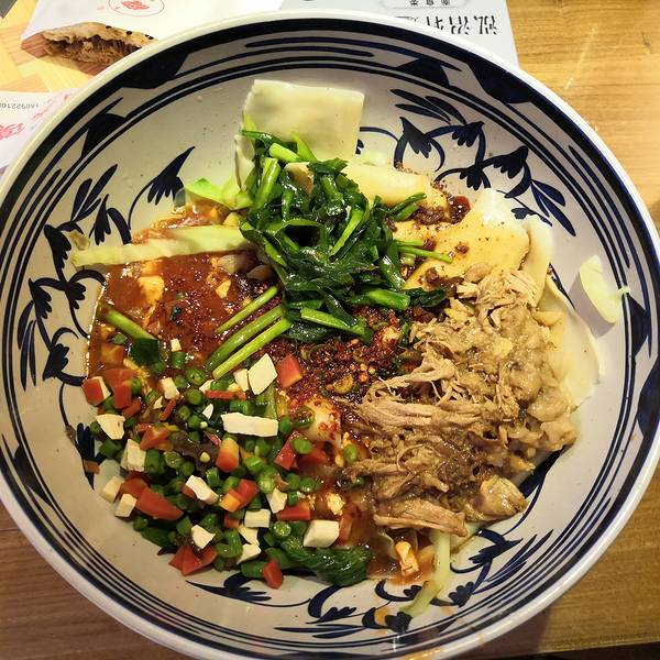 离我们住的酒店比较近,biangbiang面开的算比较早的,其他店一般都是10点左右才开。点了精品招牌面,就是四合一,比三合一多了一样腊肉汁。碗超级大,像个小脸盆,面就下面一部分,但量看上去也蛮多。面挺有嚼劲,但是拌的汁有点偏咸,整体口味差了点。这家店的味道只能说一般吧。