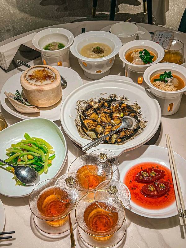 👉🏻推荐私厦焖鲍姜母鸭、双色双味卷、发菜海皇带子羹、粉丝蒸大扇贝、黑鸡纵炒虾滑藕贴,精致的菜品