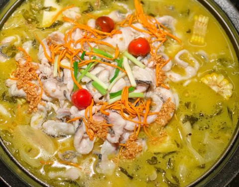 在成都,如果喊我推荐吃酸菜鱼的地方,我肯定会推荐这一家,不管是酸菜鱼还是其他小菜,味道都非常好。 这家店的位置在群光八楼,出直达电梯左转就是,离电梯好近。 菜品推荐 小菜:|初恋糖醋排骨^全部是精排和脆骨,味道酸甜,作为开胃小菜我超级喜欢。|凉拌鸡片^的红油很香,鸡肉很嫩。我们一桌四个人吃,这两道小菜是吃的干干净净。 他们家酸菜鱼有几个口味,我们点的|黄金蒜老坛酸菜鱼^,这个口味我非常推荐。吃鱼之前的开锅还非常有仪式感,先淋上酒,再点燃锅盖。画面非常好看,火苗灭了以后再开锅吃鱼。 鱼肉入味,汤汁很好喝,可以直接喝,吃完嫩嫩的鱼肉,汤汁还可以再煮蔬菜,我极力推荐莴笋片和黑豆花,不会错哦!