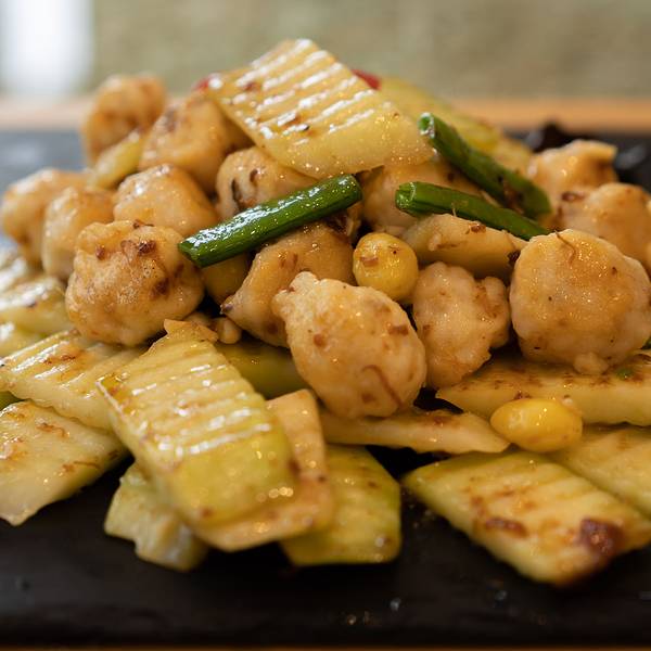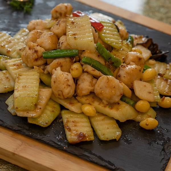黑松露笋壳骨香炒球,笋壳鱼是顺德人情有独钟的养殖鱼类,其肉质特别鲜嫩爽滑,备受厨师推素,