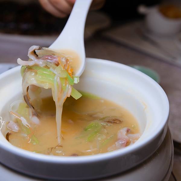 🏠寻味顺德•珍之宝酒楼(银钻店) 📌地址:广东省佛山市顺德区新基北路银钻广场一期3楼 🚌交通:300、919路 "银钻广场"站寻味顺德打卡点“珍之宝酒楼”,在顺德开有数家分店,每一家生意都很红火。这家位于新基北路银钻广场的店,交通便利,大型停车场凌晨12点前免费。超级无敌无柱中空大堂,能筵开百席,进门只有惊叹,入口处的墙壁上挂满了珍之宝的获得各种荣誉。在20世纪90年代,作为广东省第一个无公害农产品称号的,就是顺德杏坛镇桑麻村的特色农产品“桑麻黑毛节瓜”,相比于其他节瓜,桑麻黑毛节瓜清甜粉糯,更受食客追捧,售价也高,称为节瓜中的“爱马仕”。4月中旬开始,越来越近入夏,茂密的茸毛、墨绿油亮的瓜皮、小巧玲珑的瓜身,桑麻黑毛节瓜新鲜上市。用餐人不多,可以到旁边小厅,小圆桌,餐距很宽,装饰简洁明亮,服务热情。节瓜拆鱼羹 和传统的顺德拆鱼羹有所不同,上桌是一盅上铺新鲜已拆骨头的鱼片,下面是用黑毛节瓜切成的瓜丝和姜丝、陈皮丝、雪耳、紫菜、木耳等配料,由厨师推着料理车到餐桌前,把鲜汤加热至滚,淋在鱼片上,搅拌均匀可食用,鲜!!!章鱼煲淋黑毛节瓜 黑毛节瓜节瓜柔软入味,入口即化,配以清甜鲜香的瑶柱,提鲜的章鱼,鲜甜可口,原汁原味。澳门化皮烧肉 肥瘦相间,皮脆肉嫩,色泽金黄,入口咔咔脆响,伴碟有泡菜解腻,还配有白砂糖和豉油;玻璃乳鸽 乳鸽名为玻璃,形容的是皮薄又脆,乳鸽肉汁都锁在嫩肉里,拿在手上吃着咔咔脆,满嘴油,过瘾;罗定鱼腐浸海带苗 粤西地区罗定的特产“皱纱鱼腐”,登上过《舌尖上的中国》,是国家地理标志保护产品。外形像圆球,皮薄轻透如纱,入口轻软嫩滑,配上鲜嫩爽口,清爽开胃的海带苗。