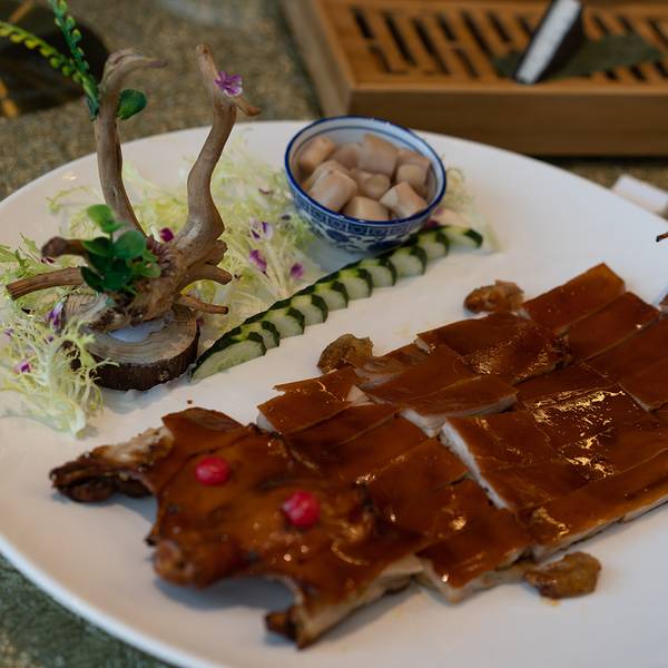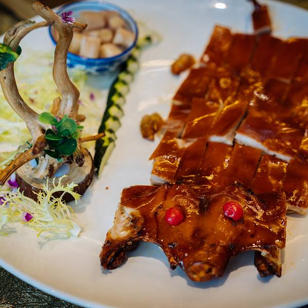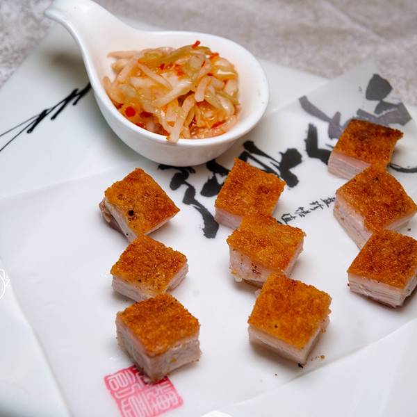 脆皮无骨功夫猪:特选六斤以下的原只新鲜奶猪,均匀涂抹秘制酱盐,自然风干入味。外皮香脆,入口不腻
