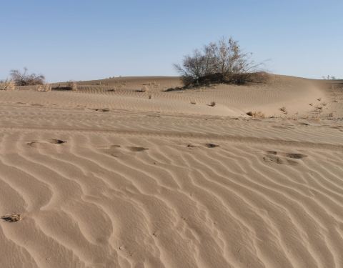 看着阿克巴尔打开公园大门的那一霎,我的心情愈发激动,仿佛即将进入侏罗纪。行驶在如此广袤的大漠间,忘却仍身在公园内。登上如一朵含苞待放的莲花瞭望塔,远眺望不到边际的公园,心情分外明朗,一扫之前两天的阴霾遗憾。脚下不知名的植物,黄黄灰灰的颜色并不亚于满眼绿色植被。此时大家都已分散开,各自找感兴趣的角落去了。独自走在荒漠中,极有探险感。
