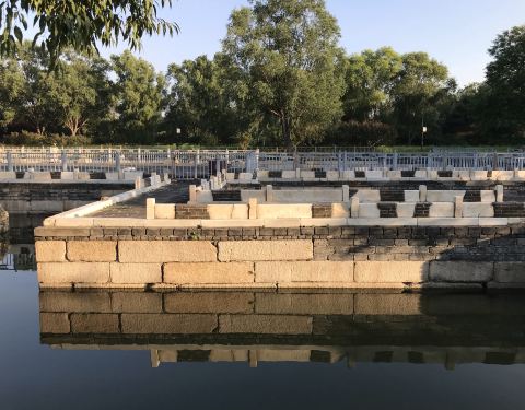 圆明园遗址公园西部是圆明三园之圆明园景区,那天在西北部荷花基地看完荷花,向南逛去,看见一处很漂亮的桥,是一处修复的古桥,栏板用玻璃罩保护。登上石桥,映入眼帘的是一处修复的池塘,名坦坦荡荡,是圆明园四十景之一。池塘里还有太湖石假山,池塘由廊桥分割成三个,一大两小。据介绍这里是皇帝饲喂和观赏金鱼的地方,也称金鱼池。池塘方方正正,面积挺大的,修复保留了原条石,缺损的用仿古砖砌筑。这个古桥是汉白玉的,名碧澜桥,桥中栏板上有乾隆御题的碧澜桥三个字,这块御题栏板还能找到实属不易,周围景色非常好。东面就是后湖,南面是九州清晏,坦坦荡荡建在后湖西侧的一个小岛上。