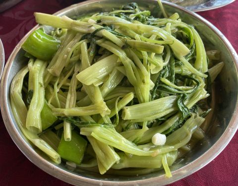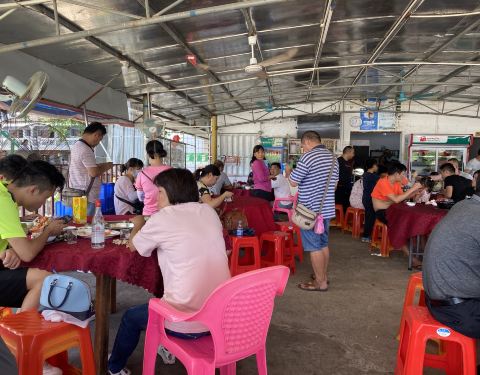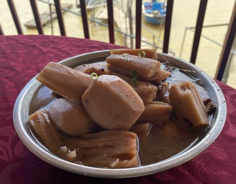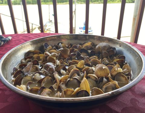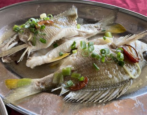 旅游来到江门新会,最近有一个网红小岛——石板沙村,过来打卡一下。进到岛里已经是中午饭点了,草草逛了一小会儿小岛,然后来到了这一家餐厅吃饭。餐厅位于石板沙村的边上,看着西江美景用餐,就在上岛码头旁边,最边上的那一家餐厅就是了。最近的游客比较多,正饭点经常没有位置,我们进来的时候刚好有客人离开,才有桌子。这里没有菜牌,水池里养着一些新鲜的河鲜,冰箱里也放有一些食材,然后自己加以想象,或者是看看隔壁桌吃什么,点菜就这样子进行的。 {蒜蓉蒸黄沙蚬},这种做法是店里推荐的,因为这一个小岛以黄沙蚬为出名,渔民们在江里打捞出来大量的黄沙蚬,新鲜打捞上来,所以特别新鲜,蒸的方式来烹调鲜味不会流失。黄沙蚬基本上没有什么沙,偶然还会有一点点,贝壳大小均等,用铜盘清蒸,盘子里面的汁也是可以用来拌饭,很鲜甜。 {清蒸立鱼},这种鱼也是西江里面的河鲜,非常鲜美,鱼的售价不贵,40元一斤,两条鱼大概8两多,鱼肉鲜嫩,一定要小心吃,骨头还是有不少。清蒸的做法,只是在鱼身上面抹了一层盐,原汁原味,但是有点清淡,我们让服务员给一碟酱油,他们送来了一碟姜蓉,蘸姜蓉吃有点特别,但是也挺不错的。 这里的生意非常好,服务员都忙不过来,需要饮料的可以自己去拿,他们会帮你计价的,放心。
