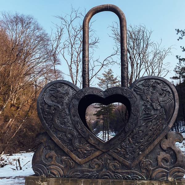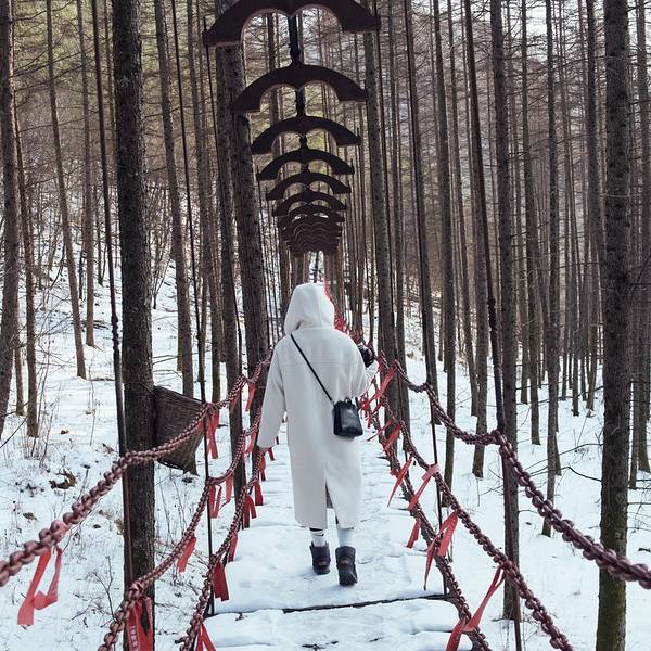 有时候,不用刻意去找景点,沿途的风景也特别的惊艳。从紫柏山出来,景区门口两百米处那个被冻住的瀑布与河流深深印入我的脑海,静止的画面充满着诗情画意,像被冻住的美好时光,令人无限的遐想。不过,被冻住的厚度不算太厚,千万不要随意冒险踩踏,以免跌落打湿鞋子。沿途那一层厚厚的雪,让大地换上了一件银白色的冬装,也成了一道靓丽的风景线。不知不觉车子就开到了情人谷,这个听名字就很浪漫的地方,谷内有五百亩落叶松,红水河流经山谷,大雪覆盖矮桥,是条非常幽静,适合漫步林海雪原的山谷。每一处都特别适合打卡拍照,每一个脚印都在雪中留下了深深的印迹,听着吱吱的声音,觉得时光似乎都变慢了下来。我想,如果是和相爱的人一起踏上这木质吊桥,一定能留下美美的回忆吧,一定有助于爱情的升温。