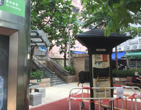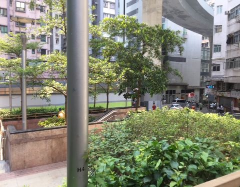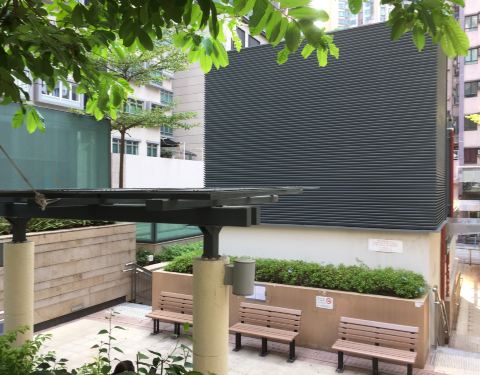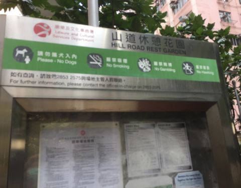 港铁香港大学站有一个山道出口,出来就是山港休憩花园。因为是依着地形而建,花园也是一条倾斜的休闲地方,由于上面是行车天桥,刚好挡住太阳,地方不会太热。