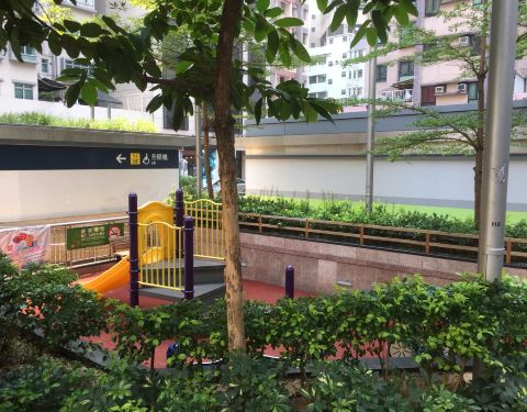 因为是依着地形而建,花园也是一条倾斜的休闲地方,由于上面是行车天桥,刚好挡住太阳,地方不会太热