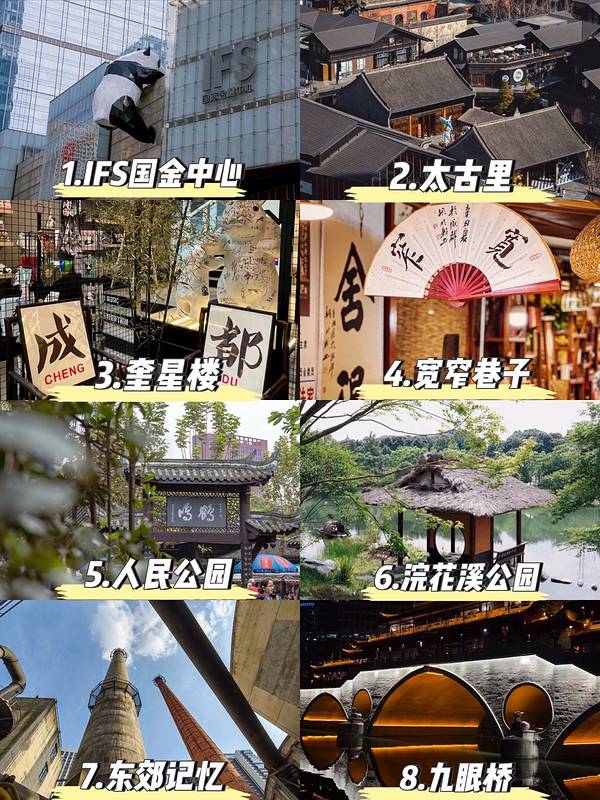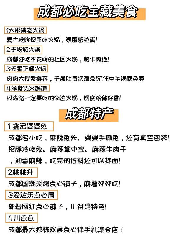 希望每个去成都的姐妹都刷到这篇攻略🙏||整理了一份超级实用的成都攻略!👏 ✅出发前准备 1⃣️证件类:身份证、学生证 2⃣️电子设备类:充电器、充电宝、耳机 3⃣️护肤类:防晒霜、墨镜 4⃣️鞋子:运动鞋,凹造型的小皮鞋 5⃣️衣服:外套,短袖,裙子 ✅避雷建议 1、一定要去【大熊猫繁育基地】看网红花花🐼 2、一定要去【人民公园】喝盖碗茶☕️ 3、去吃【小吃街】只有一天逛的话,要离市区近就【建设路】,远一点就【柳浪湾条】 4、住宿要选地铁口🏨 5、提前下载【天府通】🚇 6、不要在【宽窄巷子】里面消费🚫 ✅必打卡景点 1⃣️【宽窄巷子】 2⃣️【春熙路】 3⃣️【锦里】 4⃣️【大熊猫繁育基地】 5⃣️【武侯祠】 6⃣️【人民公园】 7⃣️【九眼桥】 8⃣️【都江堰】 ✅美食推荐 吃火锅🍲、串串🍢、川菜🥘、脑花儿🧠、小吃🍡、冒菜🌶️等等等~浅浅推荐几家 火锅:棚棚老火锅、隔壁老火锅、老子火锅、罗二火锅、666老火锅 串串:冷锅周记竹签串串、热锅龙户人家 川菜:张烤鸭、集源江湖菜、温记府庙豆汤饭、饕林、拈一筷子 小吃:蛋烘糕、糖油果子、甜水面、冰醉豆花儿、麻辣兔头、冷吃兔儿、冒菜 茶摊:春宵茶食、自得茶馆、东门市井 夜市:流浪湾夜市、抚琴夜市