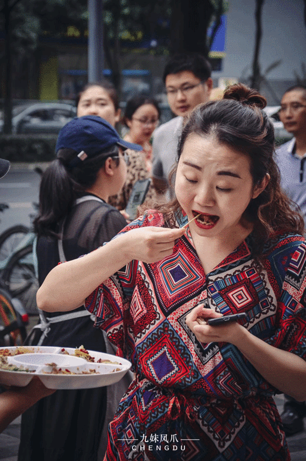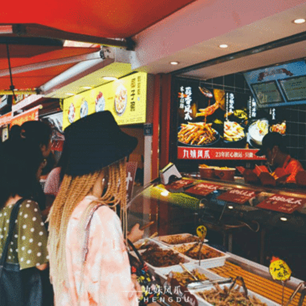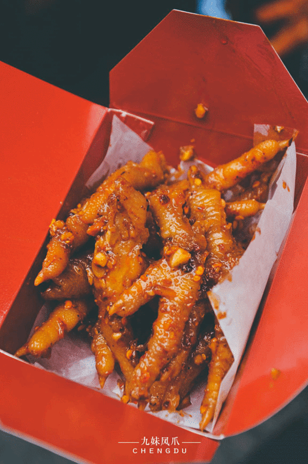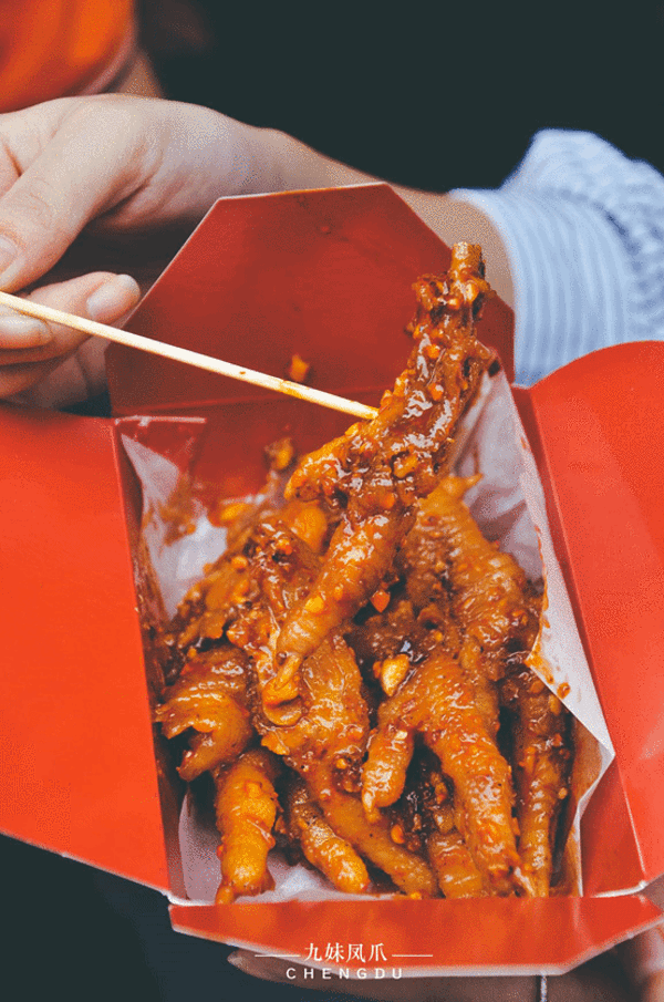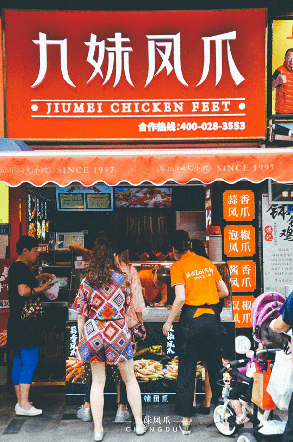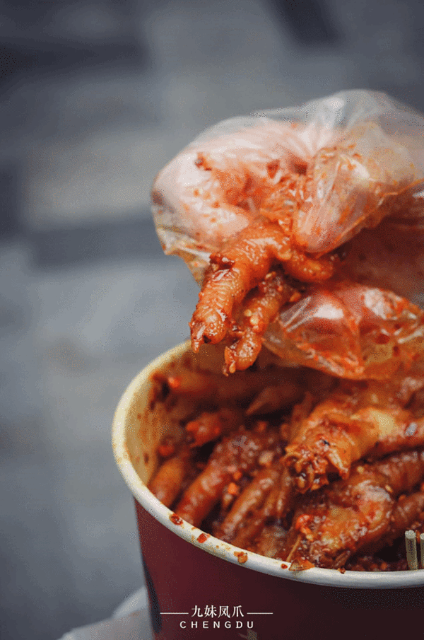 说起春熙路的美食我比较推荐大家一定要去EGO壹购潮流广场外面的小吃街打卡。一来这边集合了很多四川各地的特色小吃,确实不错;二来吃完可以逛一逛年轻人喜欢消费的潮流广场。尽管当天天气阴晴不定,但是这里依旧...说起春熙路的美食我比较推荐大家一定要去EGO壹购潮流广场外面的小吃街打卡。一来这边集合了很多四川各地的特色小吃,确实不错;二来吃完可以逛一逛年轻人喜欢消费的潮流广场。尽管当天天气阴晴不定,但是这里依旧是不断吸引着各方的人群,人来人往,热闹至极。春熙路人气爆棚的小吃街,无论是工作日还是双休,这里从来都是热闹光景。让我感到惊喜的是在这边发现了乐山的九妹凤爪,拉着雨萁急忙加入排队的人群。说到这里可能许多外地朋友不知道九妹凤爪,懂懂在这里还是给大家介绍一下,此前懂懂经常去到乐山,乐山的美食算是成都周边最好吃的了,九妹凤爪就是乐山最具代表性的名小吃,味道真的是一级棒,春熙路这家懂懂也看了是乐山总店在成都的第一家直营店。
