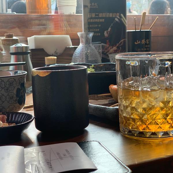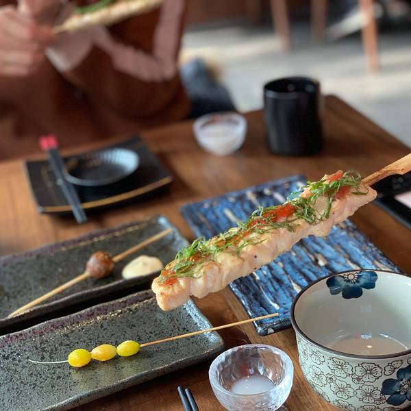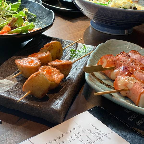 第一次来天目里就想吃的店,山葵家居酒屋,终于安排上了,期待很高哦。十一点多去的,周末大家可能起得比较晚吧,还不用排队,靠窗的两人座,很棒的位子。 我们可以喝点酒吗? 当然 「山葵家奶酒」是酸奶的味道,后面有一点点酒味儿,度数应该很低,挺适合女生的,一个可爱的小壶和配套两个杯盏。 点了超多烤串的,这个来两串那个来两串。 「培根卷年糕」裹着的年糕是刚出炉的软软的年糕,超好吃,不过冷掉就不太好了要趁热吃。「梅子鸡胸肉」第一次吃到这种做法的鸡胸肉,绝了,肉质很嫩口感很清爽。 「鹌鹑蛋」有点咸了,还好只点了一串。「明太子芝士土豆」这个有点踩雷,是普通的土豆,上面加了芝士,又甜又腻又普通,想试试的话点一串就行。 这就结束了吗,不,还有沙拉和主食。 「三文鱼牛油果蔬菜沙拉」超级超级好看,端上来的时候被它的色彩搭配美到了,因为点了很多烤串,清爽的沙拉成了本场的宠儿。 「鸡丝拉面」再次为厨师的审美点赞,看着都会让人很有食欲。「烧肉饭」要是只给我这一份饭一定是能吃完的,但真的已经饱了,一不小心点多了,有点小浪费。 再推荐一款比较适合女生喝的酒「俏雅梅酒」,很清爽,不过度数相对高一点点,刚好配「烤银杏」,下午酒时间到了。加辣加辣,再多一点辣,小哥还是没有听我们的。 奇怪的眼神,不过一下子吸引来了很多顾客。 要多一点辣。 超香超香的炸鸡,新鲜出炉。 在天目里负一层,那条美食街的尽头,或者说开端。 小份有七八块的样子,价格的话是18