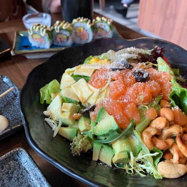 「三文鱼牛油果蔬菜沙拉」超级超级好看,端上来的时候被它的色彩搭配美到了,因为点了很多烤串,清爽...