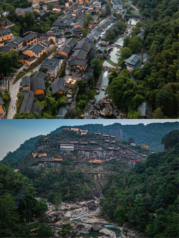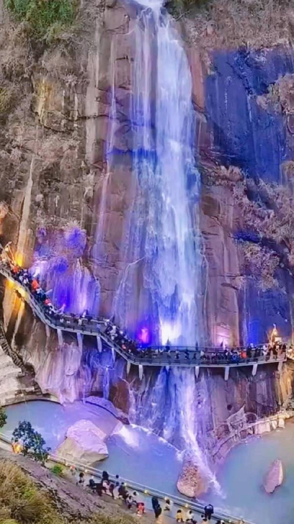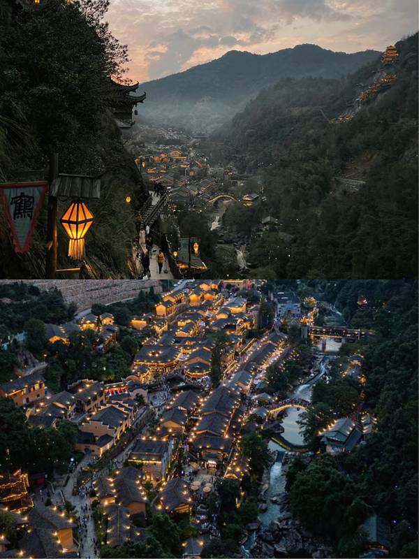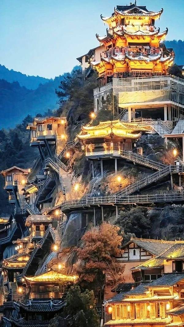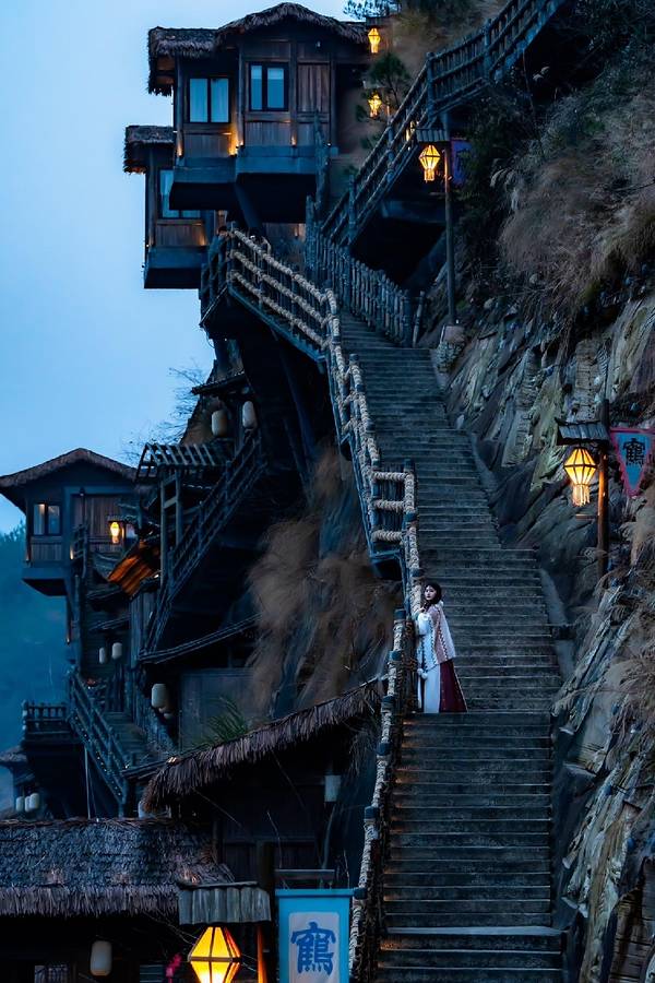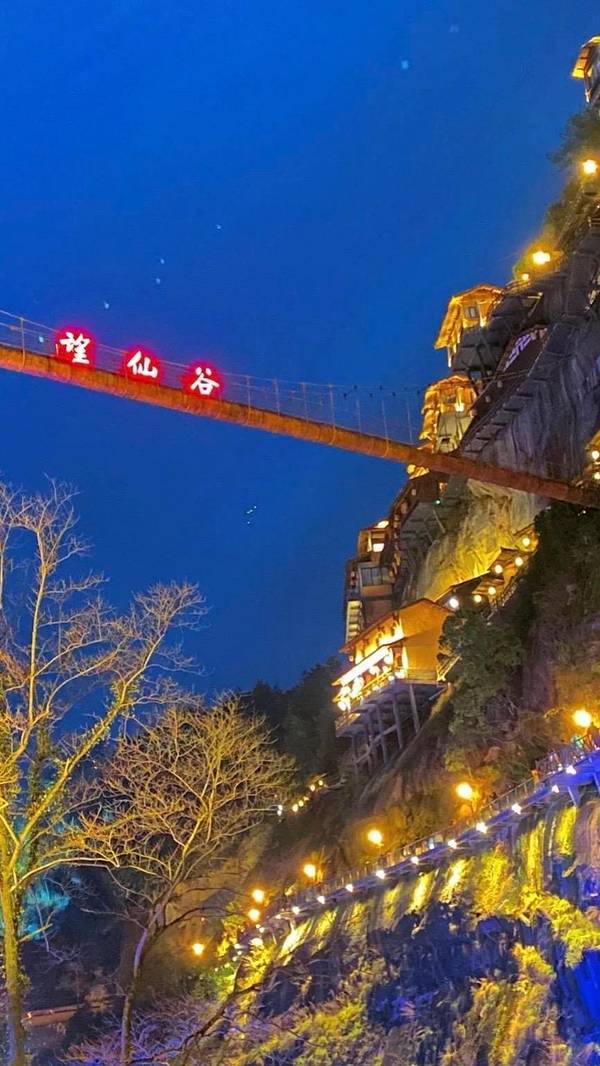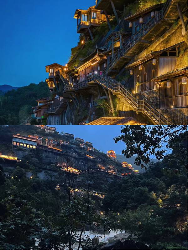 ▲悬崖民宿群+百尺飞瀑!汉服拍照圣地,傍晚悬崖栈道亮灯时,仿佛《苍兰诀》场景还原