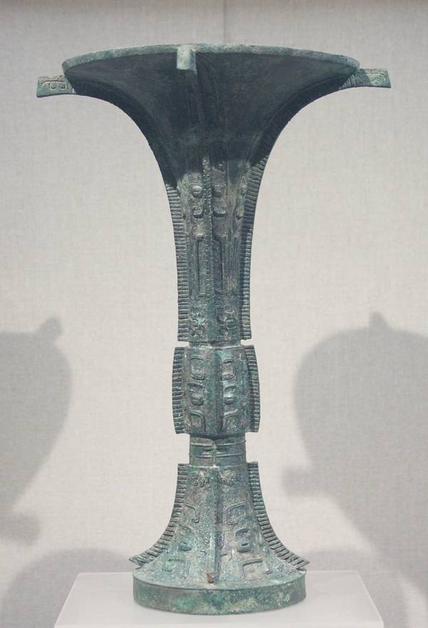 这件商晚期青铜天黽獻亚觚腹部装饰两个内捲角型兽面纹,四条出戟两个为鼻基线,两个作分界,佈云雷纹地。腹、足之间设两道弦纹,有“十”字孔,只留其形,不贯穿。圈足以四出戟为轴和界,满工云雷纹地。上层装饰...