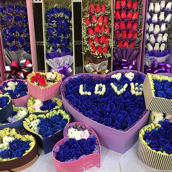 玫瑰有的五块八块一把 我买的15一把17支的双色玫瑰 活了三天了还挺好 北京不常见很喜欢。蓝色妖姬就是干花自己染色的15一把10支扎手的很 不过以前没买过蓝色妖姬不懂 尝试下。向日葵双花瓣的10元五朵。普通的向日...