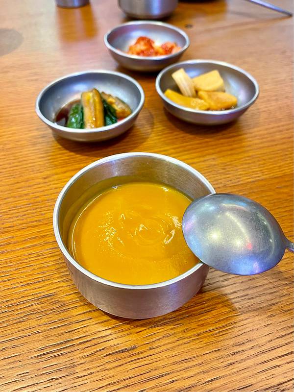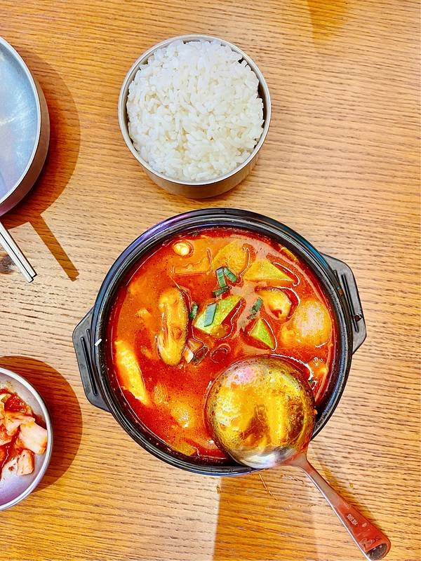 听说过“听说过”吗?😂😂😂 在隔壁一口气炫了半杯杨枝甘露后,队友说他饿了,饿到走不动道...... 直接点了一份他的最爱“海鲜豆腐汤”配大米饭。 餐前服务员给上了几碟韩式小菜,泡菜、腌黄瓜、腌萝卜、南...