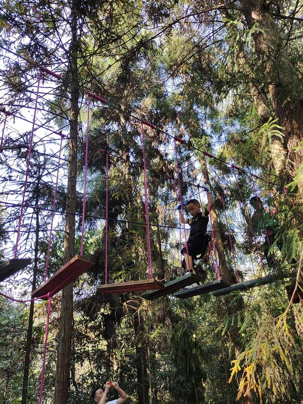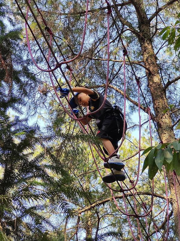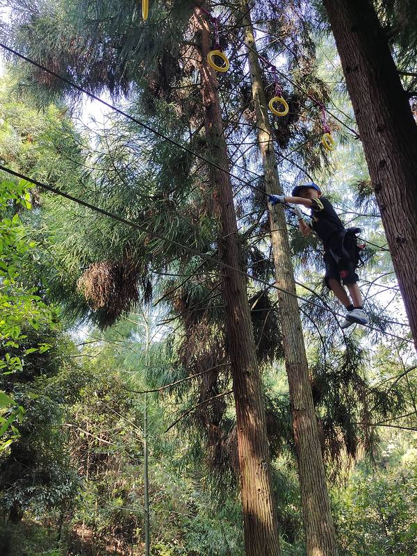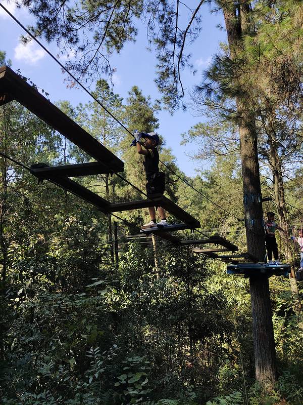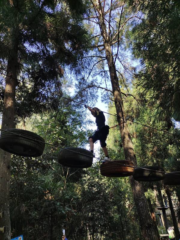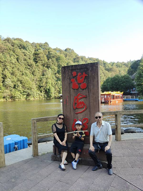 最后一天原本只安排去龙潭湖景区,看看猴,划划船,玩玩水,便在下午趁早返回主城区。不料龙潭湖景区只有乘船方可进入,或许是控制景区人数,亦或是摆渡船运力不足,渡口上早已排起了蜿蜒的长队,等候时间在一个小时开外。关键是返程时大概率还得如此等待,所以不得不另作打算。临时决定更改目的地为洪海景区。怎知一路堵车严重,历经波折终于在午饭之后到达。 洪海景区实际是一个水库湖泊,有些类似武汉黄陂的木兰天池。景区入口到深处可以步行,单程约五公里;也可以乘船,单程20多分钟,往返45元/人。我们一行有老有小,还是选择了坐船观赏。摆渡船畅游在湖中岛屿之间,水面并不算开阔,更像是缓缓游弋于水路纵横的芦苇荡中。岛上分布着数家湖景的农家乐,需要乘船才可到达,装修也更高档别致,想来价格会上一个档次。下船的码头附近是一个游乐场,项目不多,也多偏低龄,不过全户外可供成人挑战的丛林穿越,被儿子顺利拿下,让爷爷奶奶称赞不已。乘船返回前的最后一站是渝黔界碑,是重庆和贵州交界立碑之处,分别立有重庆直辖前的川黔界碑和如今的渝黔界碑以及古时候巴国和夜郎国的古界碑,界碑两侧街道集市售卖着两地各种土特产,让人回味起村镇赶集的感觉,也颇具风味。