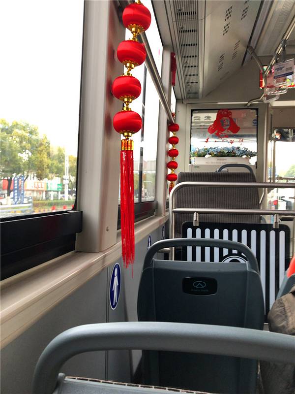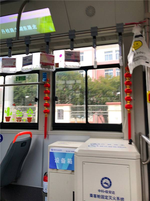 这个名字还是挺好听的呢。丹桂路。正好坐到这个公交车。感觉这个公交车布置的比较有特色的。看来是用心的。有红色喜气的灯笼。还有塑料袋。感觉比较温馨的样子。电子屏幕也看得比较清楚。这个站在哪里。哪里下来也比较方便。