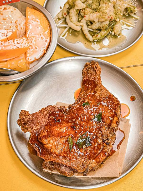 在北京路闹市中有一家宝藏泰国菜小店。性价比很高,人均50就能吃饱饱啦👏周末就约着朋友一起来打卡❤️ 📍店铺在广百旁边,环境不算大,但一到饭点就排满了人。记得要提前取号噢!🇹🇭可以坐在门口吃,更加有泰国街头的味道。 九层生炸鸡全腿 超大一只金黄酥脆的炸鸡腿。提前腌制过再炸,很入味。鸡腿肉很嫩,但我觉得鸡皮更好吃,很有嚼头。 金牌凤姐无骨爪 地道的泰式风味,酸酸辣辣很开胃。无骨凤爪吃起来也很方便,很入味。 芒果拉丝糯米饭 甜甜糯糯的口感,我真的超级爱吃。芒果的份量也很大,而且很香甜。 曼谷爆浆虾肉棒 咬开就直接爆浆了‼️炸的很酥脆,里面的虾肉口感不错,吃着特别香。 颓废冬阴泰苏打 喝起来真的很清爽!里面还放了香茅和小米椒。淡淡的香料和苏打水真的很搭。 🇭店名:泰盏鬼·颓废冬阴(始创店) 📍地址:广州西湖路小马站1号之1 🚇交通:地铁1/2号线公元前站出入口步行300m