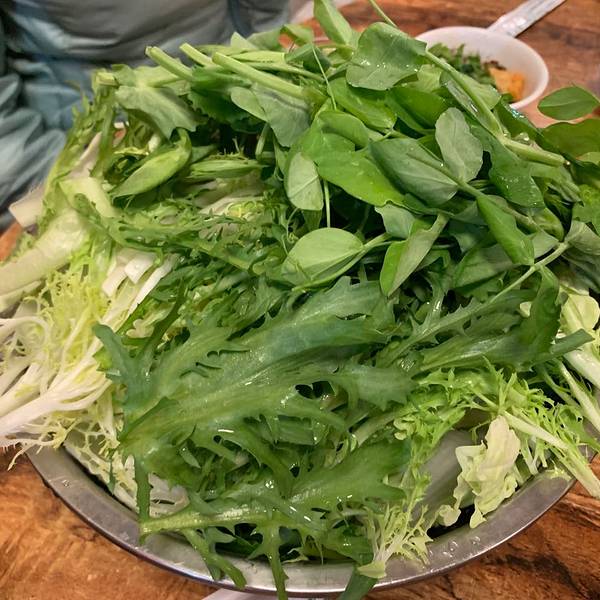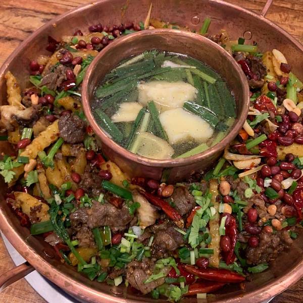 在贵阳难得看到盘县普田铜锅牛肉的餐馆,自从在晴隆县沙子镇吃到过一次以后,对其味道久久不能忘怀。 他家门口的对面路边有划线停车位,停车不愁,只是停好后步行远近的问题。 店铺干净整洁,墙上多余的宣传,是正经做餐饮的样子,非昙花一现的网红店。 老板听口音是盘县人,比较热情。 铜锅的中间是清汤烫蔬菜的地方,虽说是清汤,但是店家还是厚道地加了两大坨油,蔬菜吃起来不会觉得寡淡。 主打的干锅就在清汤锅的外面一圈,以牛肉为主,搭配红衣花生米、狼牙土豆。牛肉用干红辣椒炒制,干香干香的,肉质相当不错,肥肉部分有奶油的香味,带筋的部分嚼起来味道醇厚。吃辣不太行的朋友记得让店家少放一些辣椒。花生米的脆度稍有欠缺,建议改进。 总的来说,味道中等偏上,性价比合适,值得一试。