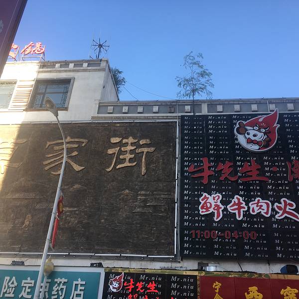 莫家街是西宁最古老的街道之一,迄今已经有六百年的历史了。在今天的西宁人和外地游客眼中,莫家街就是一个青海美食集中区。青海的酿皮、炒凉粉、酸奶、油炸糕、面片、抓面、羊肉串……这里应有尽有。今年,原莫家街市场搬迁到了莫家街综合农贸市场,属于莫家街的历史再次被刷新,但是关于莫家街的传说并没有消失,依然留在人们的心中。 这里小集市,各式吃的、用的、小商口汇集于此,只可惜这里的商铺都是特么早的关门,八点半路过的时候 ,已经关闭了近90%的商铺,剩下这牌坊两边上的一部分还在营业。在莫家街对面的一条小路走进去,狭窄的路面都被走鬼小摊占道经营着,这比起冷清的莫家街是一个鲜明的对比,人山人海,水泄不通的 最后回酒店休息了,就在东大街边上,离莫家街几十米。都是旧式楼层,没有电梯,入住时拖着行李爬五楼,在这爬五楼等同其它平原爬十几楼的感觉。。。
