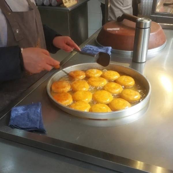 吃完饭正溜达呢,无意中看见店里的店员小姐姐在翻动这个柿子饼,金黄的色泽特别诱人,柿子饼三块钱一个,价钱适中,就和朋友买了两个尝了一下,味道还可以,香软可口就是有点烫嘴,他们家除了石子饼,还有元宵,但...