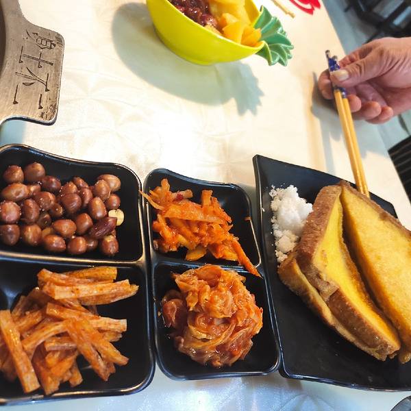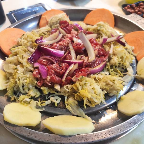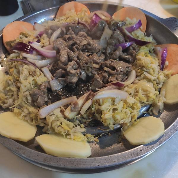 一家充满了烟火气息的小店。 之前听朋友们说过这家店还不错,正好看到有个团购不贵,于是买了来探店。 位置在明斯克KTV后身,也就是往本色酒吧那个山上走的道路右侧,奇怪,我之前为什么一直觉得就在大路边呢?不知道哪里来的错觉。 环境很一般啦,就是一个家常菜馆的感觉,七八张桌子,五六个服务员。 服务还可以吧,老板很热情,家里人在不忙的时候也愿意帮大家烤肉,很家常的感觉,就像在朋友家里吃饭。 团购菜品还可以,双人餐勉强够两个人吃,不算多丰盛,但也基本够吃。 肉类品质还可以,起码牛肉应该就是牛肉,不是鸡鸭肉来拼凑的,配上店里推荐的调料,吃起来还可以。 蔬菜、酱料、赠送的小菜、烤面包片都还可以,中规中矩。 沙拉质量就一般了,反正我是没吃几口。 整体上来说,就是为了吃饱肚子,是个不错的选择,价格便宜,质量过得去。如果想要吃的过瘾,想要有档次,那还是不要来了。 找准自己的定位和目标,总能找到适合自己的饭店,祝大家都能吃得开心。