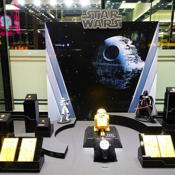 周大福的橱窗里有star wars的合作款金条以及BB-8的金制品。