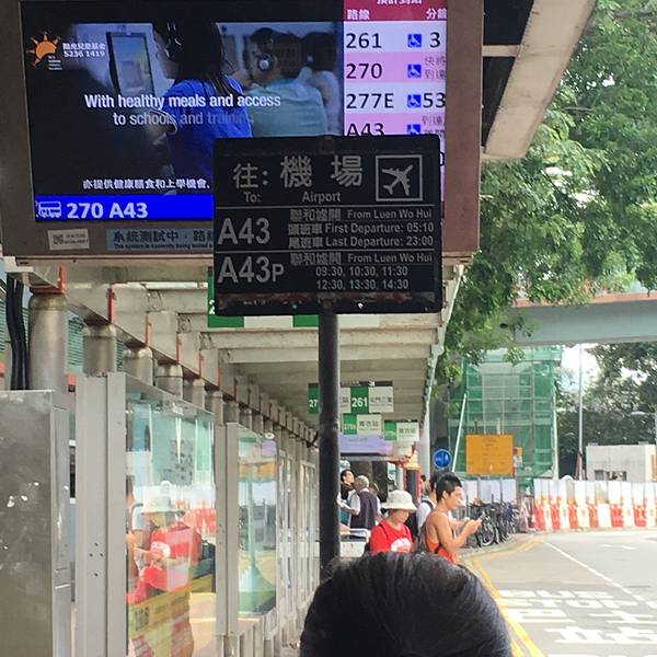 从罗湖过关后坐地铁到上水站下车,从最左边的出口出来,下楼梯就到了车站,乘坐A43到香港机场,价格30.9港币,路程一个小时。