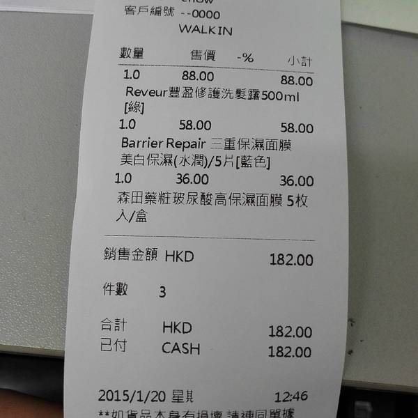barrier repair那个美白保湿面膜才卖58港币,新康街药店都卖60-70.国内有些日本代购的卖80-90人民币。还有那个reveur的洗发水88港币,好大一瓶。森田药妆才36港币。可能是楼下店铺的铺租贵吧,sasa卓越的品牌价值高些吧。哈哈