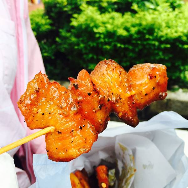 吃完返回到大路上,过桥,继续前行1KM,到达元朗广场,面对广场的左手边有条小巷,第一小摊卖的猪颈肉值得一尝,看照片觉得又肥又腻是么,3美的感受是肚子如此撑的情况下还都能吃下,而且不肥不腻,如此美味你还不来尝一尝吗~