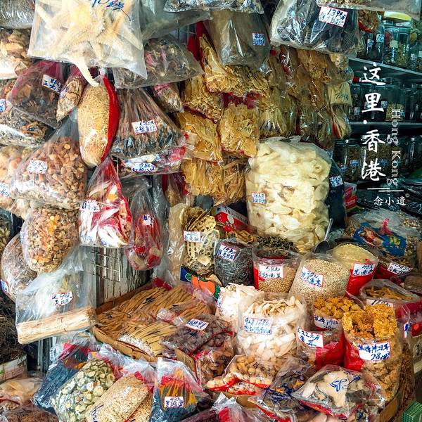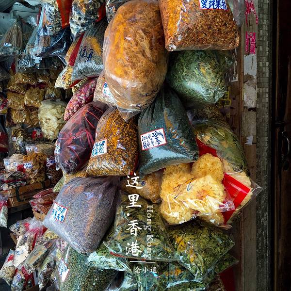 一包包的罗汉果、海藻、生薏米都是凉茶、煲汤的材料上环永乐街到高升街一带是香港早期的药材中心,称为药材街