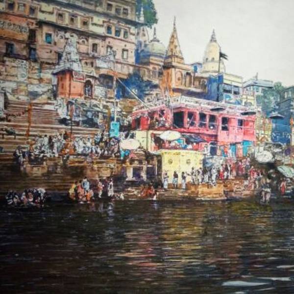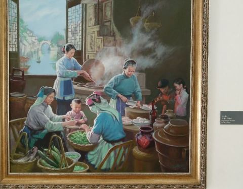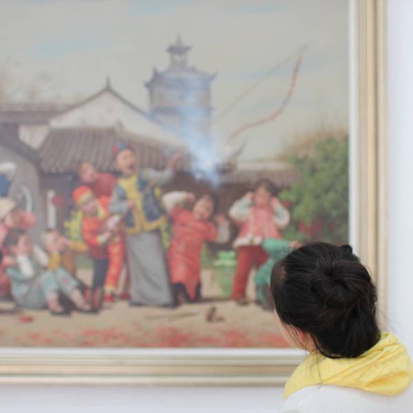 在出口处,馆内展示了许多油画,再现了古镇风情