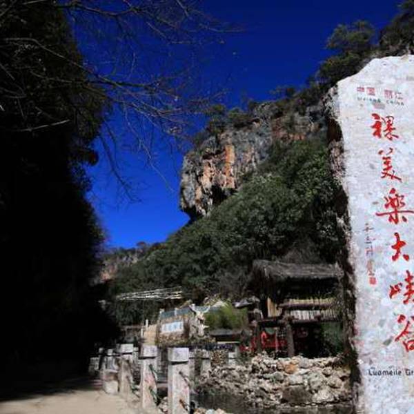 东巴谷长90公里,谷中有各种钟乳、枯藤、怪树、奇石、珍禽、鸣鸟、飞瀑,被当地人发现后称之为东巴谷,纳西语叫“裸美落“,汉语是好大一个谷的意思。