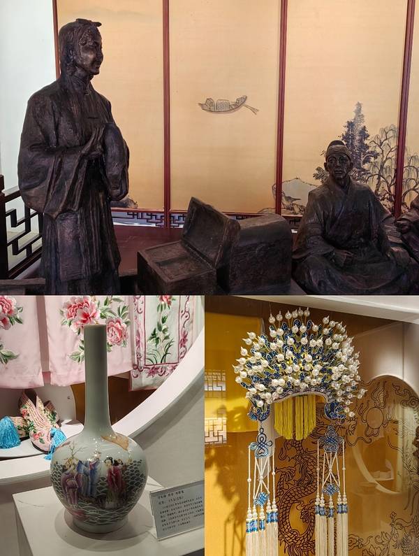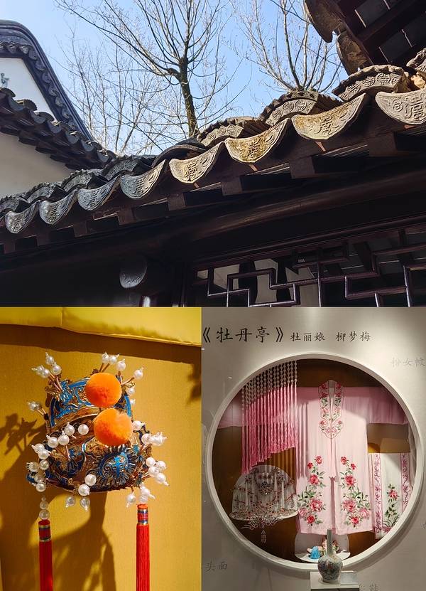 亭林园内,有一家昆曲博物馆,它坐落在园内的一片森林中,四周都是郁郁葱葱的树木,整个建筑掩映在林中,或隐或现,给人一种神秘遐想的空间。 整个建筑是由上海同济大学专家精心设计的,据说设计灵感来自于昆曲的水磨腔,匠心独运的把山上的溪水,引流到了馆内,运用了中国传统的古建筑风格+传统的园艺配搭,以戏台、观演楼为主体建筑,古色古香,绿树粉墙,互相衬托,交相辉映。 馆内有展厅七个,主要介绍昆曲的起源和发展的过程,以及对昆曲发展有贡献的名人、昆山知名昆曲戏班的发展传承轨迹等,馆藏的昆曲资料内容还是挺丰富的。 馆内的《牡丹亭》戏台,是实景版昆曲古戏台,戏台两侧是包厢,戏台正对面是看台,据说,古戏台不定期会有昆曲表演,在静谧的夜色下,赏着园林景色,听昆曲咿呀婉转,想象一下,一定是美妙至极。 看到戏台,顿时戏精附体,没有人唱戏,我们自个儿唱啊!唱一出武戏,自娱自乐、自玩自嗨,还真玩的不亦乐乎呢。哈哈哈哈~