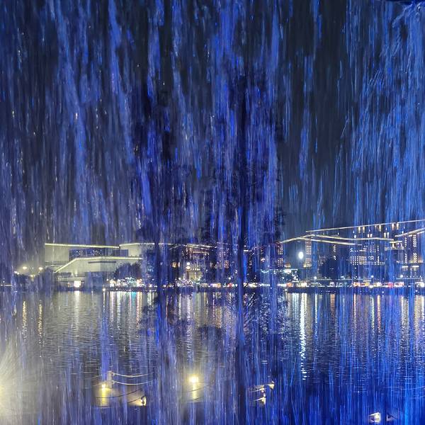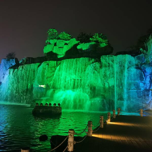 游览了西樵山白云洞,在白云洞旁边的心源阁品尝了美味的清蒸山坑鲩之后,天色已经暗了下来,看对面的听音湖和湖畔的观心小镇已经亮起了彩灯,决定去听音湖畔走走,享受一下这里的美丽夜色。观心小镇樵山文化中心是听音湖的地标性建筑,位于听音湖靠近西樵山一侧,夜幕降临后,西樵山已经变成一道黑色的屏障,文化中心大楼彩灯齐放,散发着璀璨的光芒。樵山文化中心我们沿云影琼楼酒店西侧的湖心大道穿过听音湖,来到对岸的观心小镇。观心小镇是一片商业街,正对着听音湖和西樵山,这是一处休闲娱乐的场所,吃喝玩乐应有尽有。不过,这里看起来应该还在培育期,人气还不是特别旺,不知周末或节假日的情况如何。但从其地理位置和建设规模来看,未来一定是一块黄金宝地。观心小镇的酒店观心小镇顺着湖畔的绿道漫步,感受着听音湖和观心小镇的独特魅力,天空中忽然落起了毛毛细雨,空气中增添了一点凉意,南国的冬天再冷也冷不到哪儿去,戴上风雨帽,依然不紧不慢的走着。樵山文化中心忽然听到湖面传来哗哗的水声,伸出手来,雨还是有一滴没一滴的下着,看来并不是落雨的声音。循声寻找,原来是刚才我们走过的湖心大道方向传过来的,那里有一道五彩的瀑布正喷涌而下,声音正是来自于瀑布。听音湖瀑布赶紧转过身往回走,去欣赏这片瀑布美景。远远的看过去,瀑布绵延数百米,落差虽然不大,但因为足够宽而且水量大,水流跌入湖面,撞击时发出的声音,百米之外依然很清晰。瀑布所在正是刚才我们走过的湖心大道,原来下面还暗藏着秘密。听音湖瀑布走到瀑布旁边,声音就更大了,对面说话都需要提高音量才行。湖面上有亲水栈道一直修到瀑布下面,可以近距离感受飞流直下的震撼。瀑布中还安装了彩灯,不停地变换着色彩,看起来就像是悬挂的彩缎,真可谓美轮美奂。听音湖瀑布瀑布下面,还有巨石磊成的山洞,进入洞中,感觉就像是到了水帘洞,透过洞口的水帘往外观看,听音湖和观心小镇就像是人间仙境一般。 据了解,听音湖瀑布是西樵八景之一,这是一个人工瀑布,宽度达228米。平日里只有晚上七点半到九点才会打开,如果是周末或节假日,上午九点到十一点、下午三点到五点都能看到,晚上则一直开到十点。