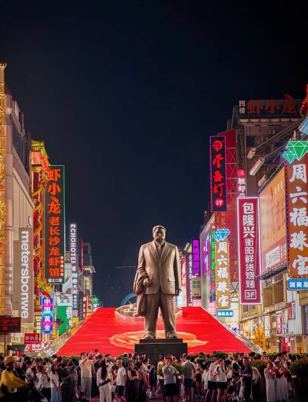 在潮流与时尚方面,五一广场同样引领全城。IFS国金中心高耸入云,高端品牌云集,七楼的KAWS雕塑早已成为全国知名的网红打卡点,年轻潮人络绎不绝。黄兴路步行街霓虹闪烁,巨幕大屏轮番播放着时尚大片,街头艺术、快闪表演、文创小店随处可见,现代感与氛围感拉满。夜晚灯光亮起,整座片区流光溢彩,高楼与老街相互映衬,既有都市的繁华璀璨,又有古城的温婉厚重,随手一拍都是充满故事感的城市大片。