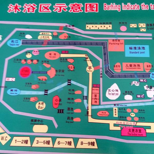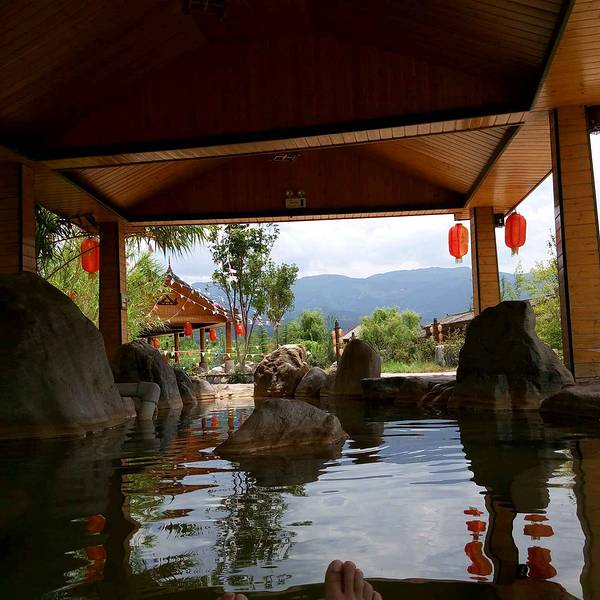 大理地热国位于大理州洱源县茈碧湖畔九气台,九气台自古既是沐浴休闲的好去处,因附近有九个洞穴喷涌出温泉故而得名。泡温泉之余,还可以感受周围山野田园风光,令人心旷神怡。 进入景区,园中心即是一个直径接近30米、水深4米的大水池,池内水气腾腾云蒸霞蔚,号称大滚锅,据说水温可达88度。32个露天温泉池错落散布在大滚锅周围,有怡情养性、净化心灵的养心池;有强身健体的药池和牛奶池;还有小鱼会来啃脚的“亲亲鱼疗馆”等,可以体验不同的乐趣。泡在温泉池中,看着蓝天白云,心情舒畅极了。 景区建有多个白族风格的院落,全部都是土木砖石结构,粉白灰墙,局部还饰以水墨山水画,民族风情浓郁。每个院子都有独立的温泉池,院子间花木成荫,环境优雅。时间宽裕的话,可以住进院中,享受相对私密的温泉体验,泡舒服后,到餐厅吃一碗饵块,尝一次三道茶,或者就直接在蛙鸣中睡去,惬意之极。 这里因为建成时间已久,很多房间设施略显陈旧,要有一定心理准备。