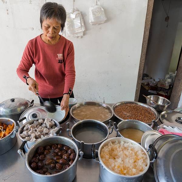 不说不知道,广东甜品还分为广府和潮汕两派,平常吃惯的双皮奶、芒果捞、杨枝甘露、杏仁糊,属于广式甜品。潮汕甜汤在口味方面更甜。据说是潮汕地区一直有种甘蔗,是粤东地区的制糖中心。所以潮汕甜汤的味道更浓郁,食材也更甜。潮汕地区的甜汤小档非常多,街头巷尾都可以见到。甜汤一年四季都有,夏季卖的是冰冻的甜汤,冬天肯定是热乎乎的。 去东山湖的路上看到路边的这家小店,从外面看,店铺不大,在门外摆了几张小桌子,胜在够干净。门口就是摆满了淋琅满目的各种热辣辣的一煲煲甜品,完全可以看得见,很接地气的一家小店,据说还是当地的网红店,生意红火时还要排长龙,下午才开档哦,几个小时就卖完。非常有幸,碰上刚营业,各种品种都齐全。 老板是个阿婆,很精神,身体很好,说的潮州话,不是太会听普通话,看样子有点不太理睬人,实际上也是很纯朴的人。甜汤种类很多,有鸭母捻、红豆、绿豆爽、云耳、番薯、芋头、甜蛋、花生、黑糯米......良心价格,八元一碗,自由搭配。我们点的时候,鸭母捻还在做,所以没点上,当我们吃甜汤时,煮好了,阿婆每人送了我们一个尝鲜,真是太好了。 这里要说一说这个「鸭母捻」,呵呵,我还以为是汤圆。鸭母捻的馅有四样,绿豆馅、红豆沙、芋泥、芝麻糖。鸭母捻放在白糖水中煮至浮上水面即熟。为区分每粒馅的不同,不同馅的鸭母捻形状各异,配上薏米、番薯、蜜枣、莲子,完美。 伟记甜汤 地址:广东省潮州市潮安区X078