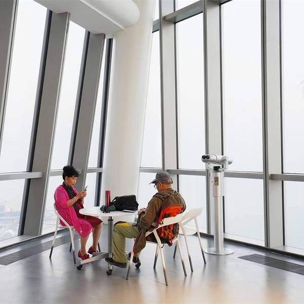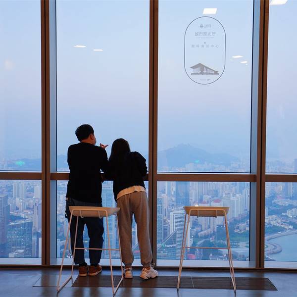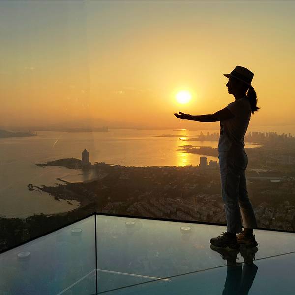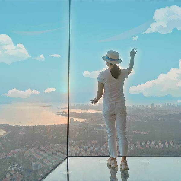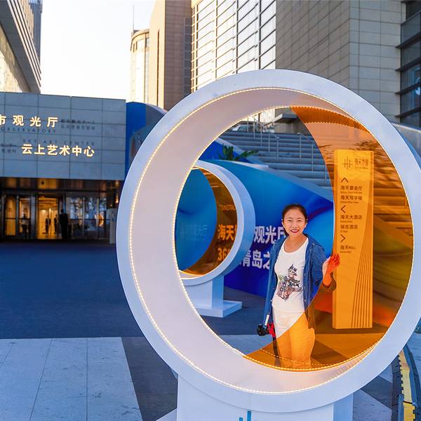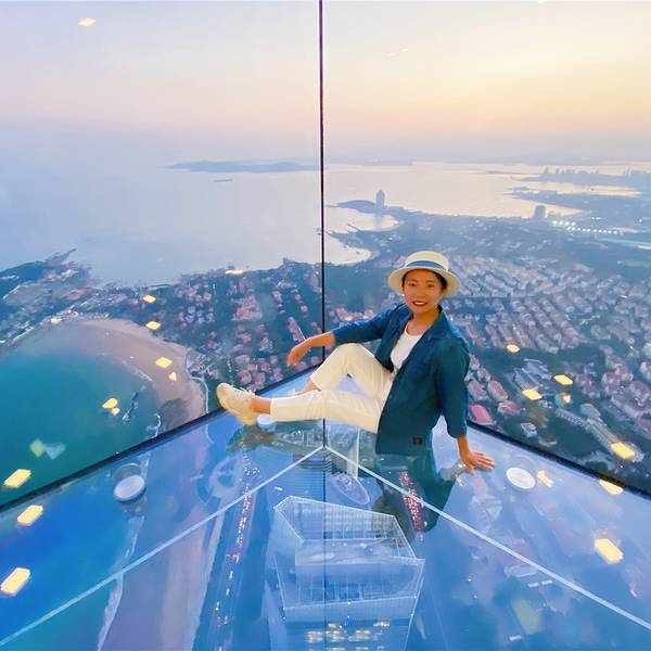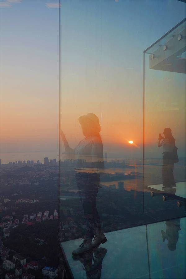 从日暮降临到华灯初上,很久没有站在楼顶看风景了,坐在宽大的落地玻璃窗前,喝一杯咖啡,静静地欣赏这万丈高楼下的海涛汹涌,高楼林立,夕阳总是那么的让人留恋,多么希望身边的爱人一直陪我看风景。秋季的青岛更加适合旅行,不燥热,海风中透着凉爽与温柔。越来越受到情侣们的喜爱。爬上青岛最高的楼,海天MALL。用航拍视角欣赏青岛的美。这里的城市观光厅,云上艺术中心,在山东算最高的楼,81层观光厅简直太美了,可以360俯瞰青岛。钻石角是拍照最美的地方,由于是透明玻璃,有种站在云端的感觉,夕阳西下的时候拍日落更美。也是欣赏青岛最直观,最壮观的打卡地。80层是云上艺术中心,是国内目前海拔最高的公共艺术展厅,经常会有很多名人画作以及各种雕塑作品展览,无论成人还是孩子都适合,最近正在展出的是《美在和同一一中国美术馆藏古今中外经典美术作品展》。这里游玩时间大概2两小时。票价:城市观光厅200元/人 城市观光厅+云上艺术中心268元/人,学生、老人有优惠 青岛市南区香港西路48号海天中心T2,81层城市观光厅与80层云上艺术中心