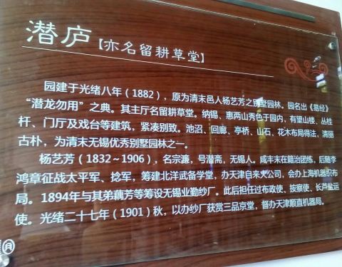 位于无锡锡惠公园旁惠山古镇内(又称:留耕草堂),是惠山古镇内最大最漂亮的一座院落。是清末洋务运动干将、红顶商人~杨艺芳的私人别墅。