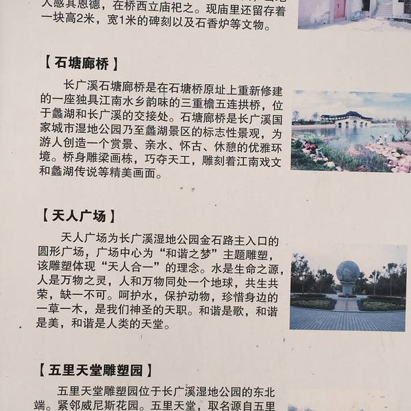 实用 我们游玩的那个周末是阴天,风比较大,如果是阳光晴朗,风和日丽,湖边走走,感觉应该不错。风再大又怎样无锡长广溪国家湿地公园位于江苏省无锡市太湖新城,西依军嶂山、雪浪山,南接太湖,北通蠡湖,形成山丘-湿地-河流-湖泊融合一体的景观格局,是2005年5月建设部首批公布的九个国家城市湿地公园之一。 但是不得不抱...无锡长广溪国家湿地公园位于江苏省无锡市太湖新城,西依军嶂山、雪浪山,南接太湖,北通蠡湖,形成山丘-湿地-河流-湖泊融合一体的景观格局,是2005年5月建设部首批公布的九个国家城市湿地公园之一。 但是不得不抱歉的讲,从这块宣传板饱经风吹雨打的陈旧模样,可以对景区的现状有个大致的估计。这个免费向公众开放的湿地公园存在疏于维护的问题。