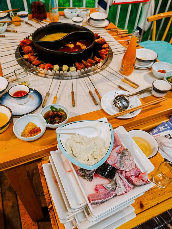 这是我吃过一次,还想再吃第二次的餐厅,来都江堰的小伙伴一定要来试试。 餐厅就在岷玉酒店附近,主要吃火锅和烧烤,火锅煮的就是都江堰特产乌鱼,没有一丁点腥味,称得上是我吃过最鲜美的淡水鱼。 烧烤有五花肉、乌鱼、乌鱼丸子、牛肉等等,味道真的是非常赞。环境很赞 可以坐在河边吃饭 但要注意手机啥的别掉河里了厨房的卫生做得很好 给人看得到的安全感利用炭火,边煮火锅边烧烤,这是我们第一次见到的吃饭方式大众点评上有套餐买,四人分量非常足