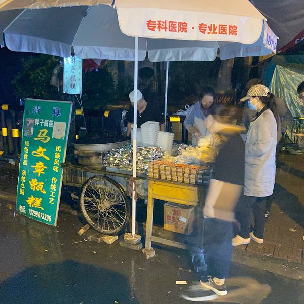 胖子甑糕全名叫马文章甑糕,实际上不是实体店而是一个流动摊点,其名气与口碑各大APP竞相推荐,去哪儿网为一个流动摊点设置一个地名就是证明,同时我五点半出门专程买这个也是证明,具体其位置在洒金桥进去50米左右杨天玉腊牛羊肉馆旁。当我顶着小雨到达时已经有不少人在购买了。胖子甑糕(甑糕,绿豆糕)共计25元。 感觉吃到嘴里后发现其实通俗的讲就是枣泥配糯米饭,不过这个枣泥非常好吃,也是酸酸甜甜的,某种意义上来说,和我去泰国吃的芒果糯米饭有异曲同工之妙,一碗的份量。绿豆糕还没吃,回去带给同事吃